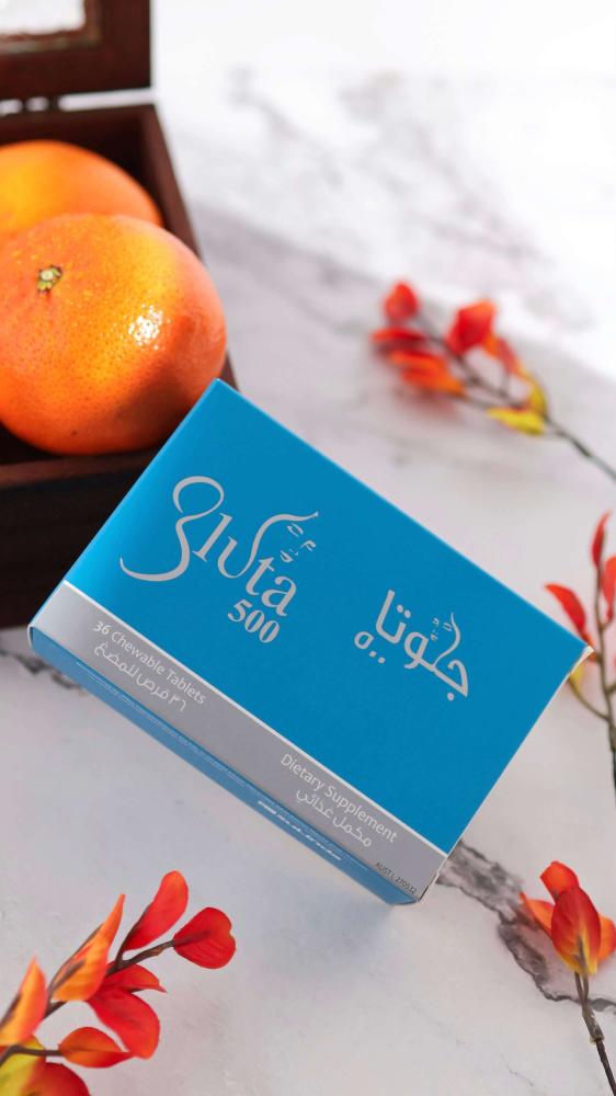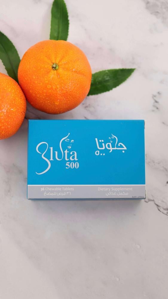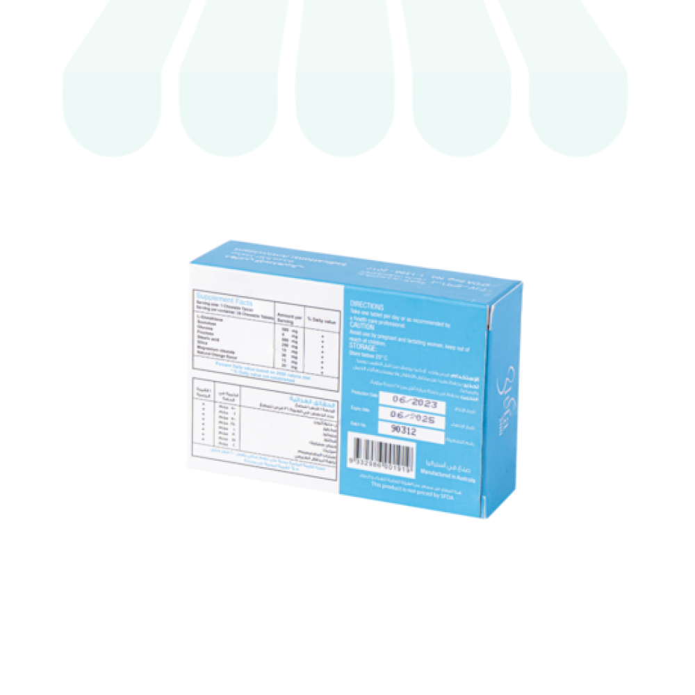 تحتوي العبوة على 36 قرص قابل للمضغ بنكهة البرتقال من مكون الجلوتاثيون بتركيز 500 ملجم وهو مضاد أكسدة يستخدم لعلاج فرط التصبغ ومقاومة شيخوخة البشرة وزيادة نضارتها .