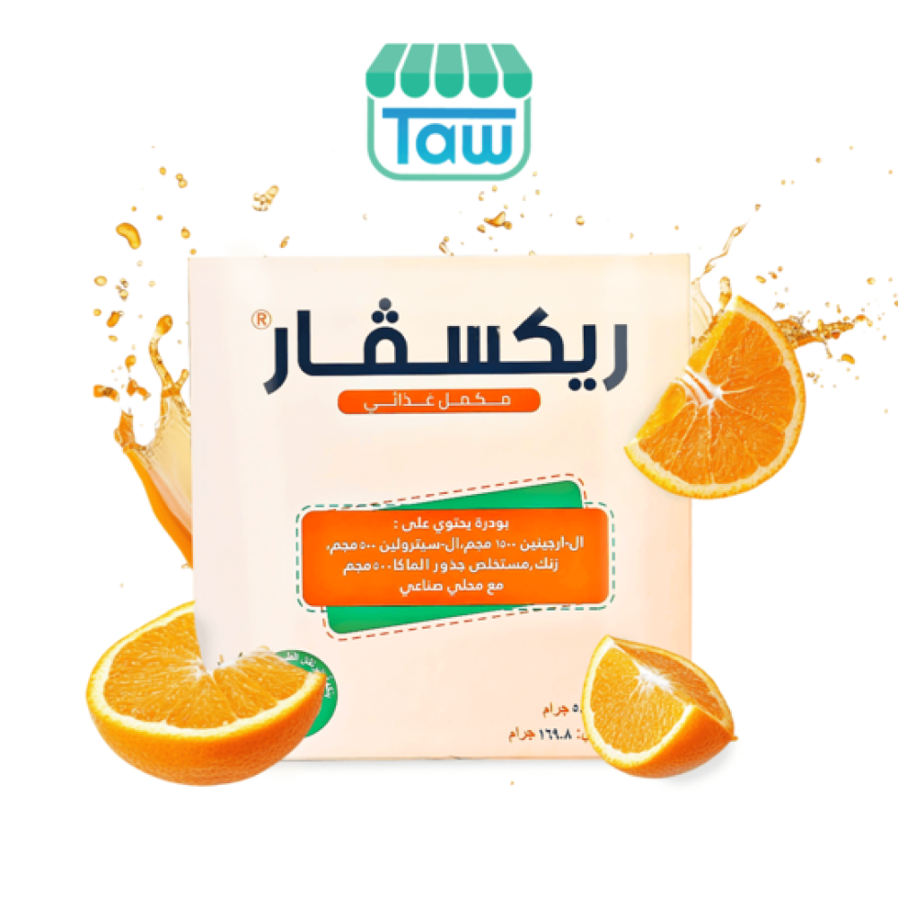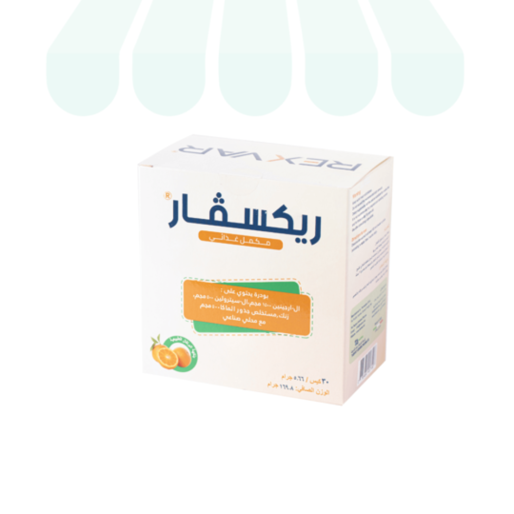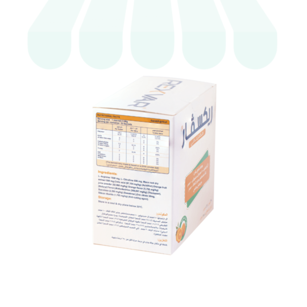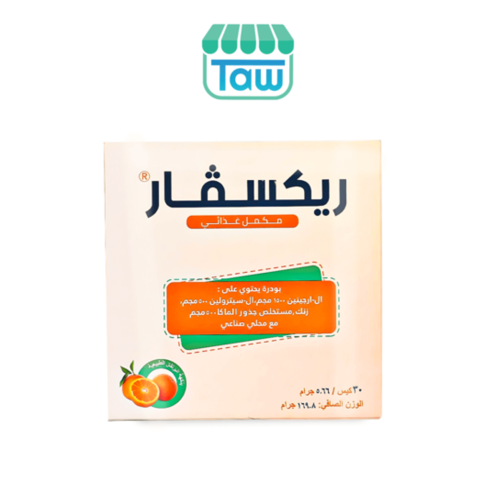 تحتوي العبوة على 30 كيس من مسحوق "ريكسفار" بنكهة البرتقال الطبيعي، الذي يحتوي على مزيج من الأحماض الأمينية والمعادن، المصممة لتحسين الأداء الجنسي للرجال وتعزيز الرغبة لدى كل من الرجال والنساء .